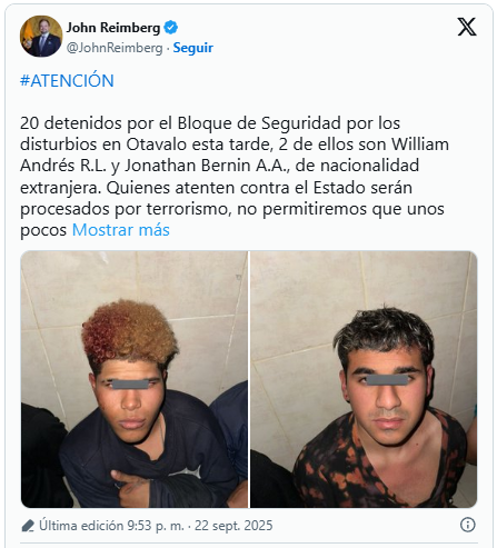 Al respecto, el ministro del Interior, John Reimberg, señaló que entre los 20 detenidos por el Bloque de Seguridad en disturbios en Otavalo hay dos detenidos extranjeros, ellos son William Andrés R.L. y Jonathan Bernin A.A.